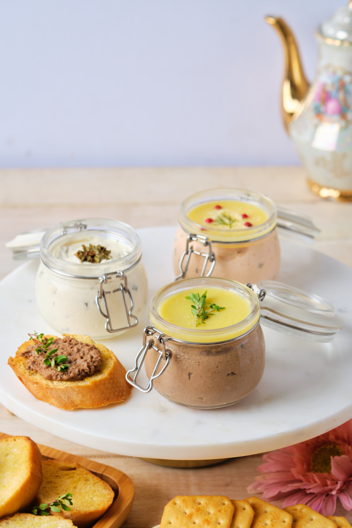 Note: Crackers or crostinis are not included. Photo shows a sample of the pâte sampler 120 grams size, not actual size.