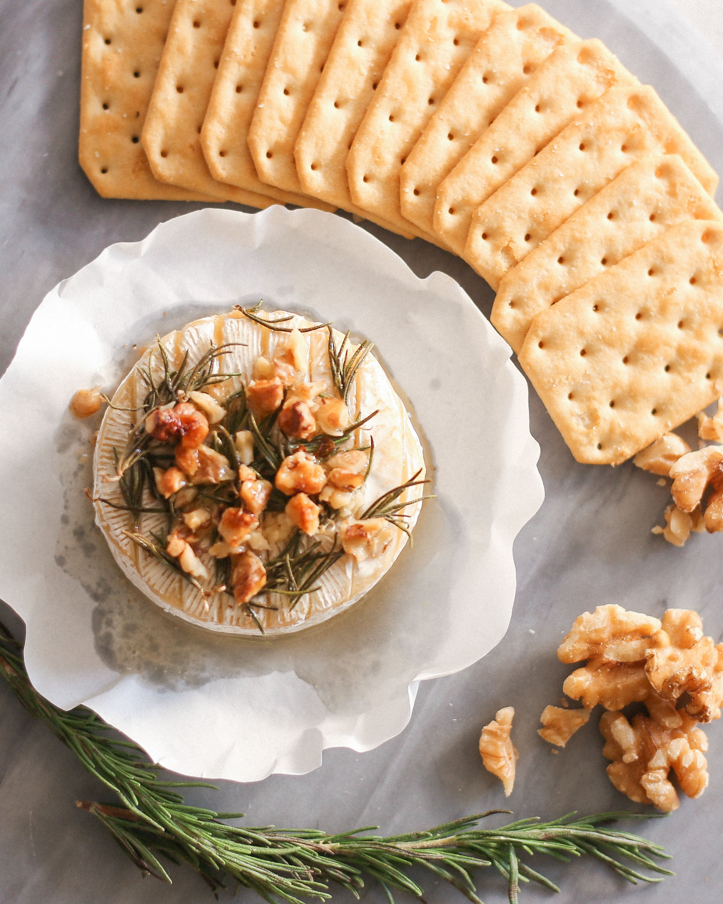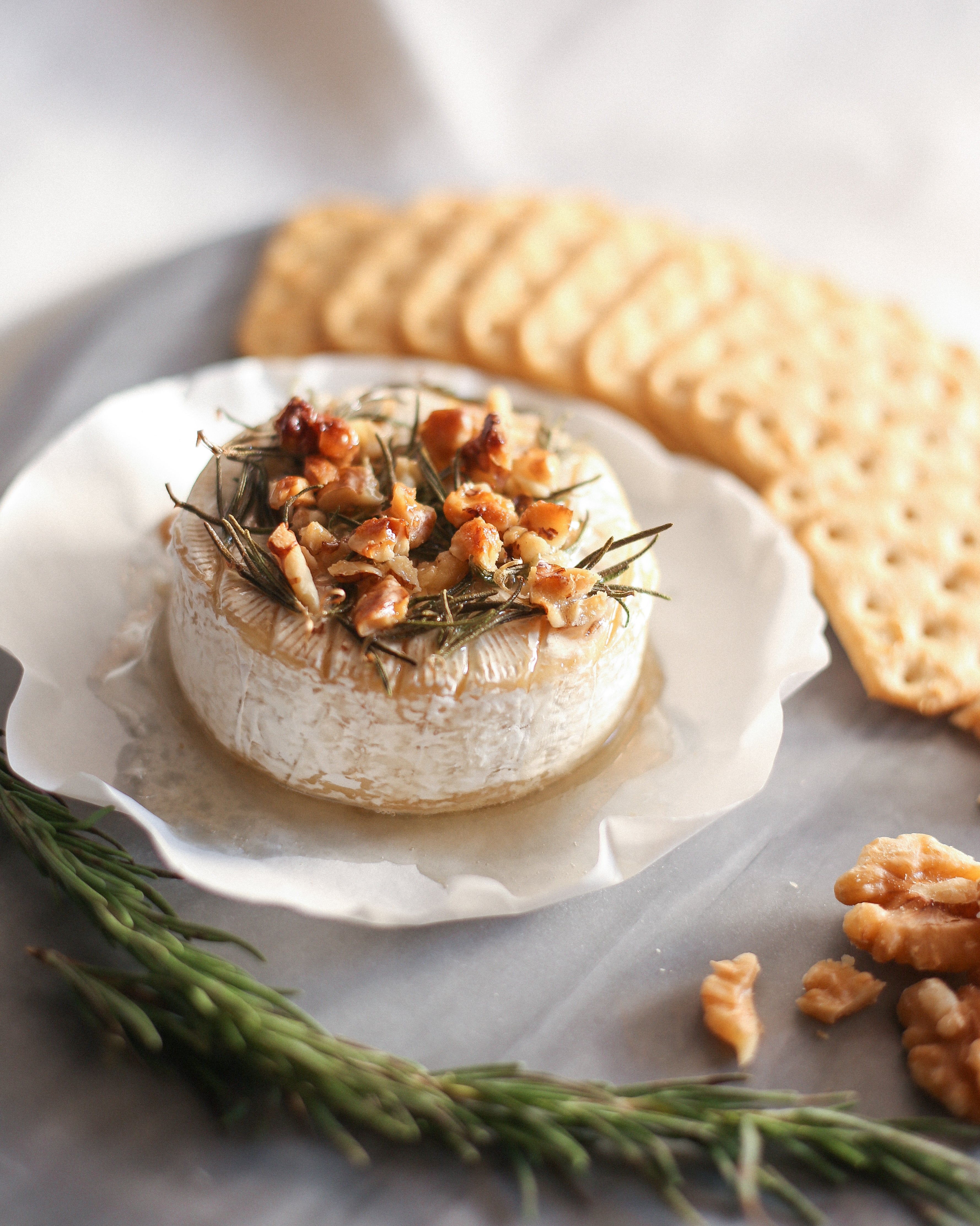 The ultimate upgrade to your quick afternoon snack or dainty tea party. Dip those crackers into the freshly baked rosemary-infused brie topped with truffle honey and walnuts.