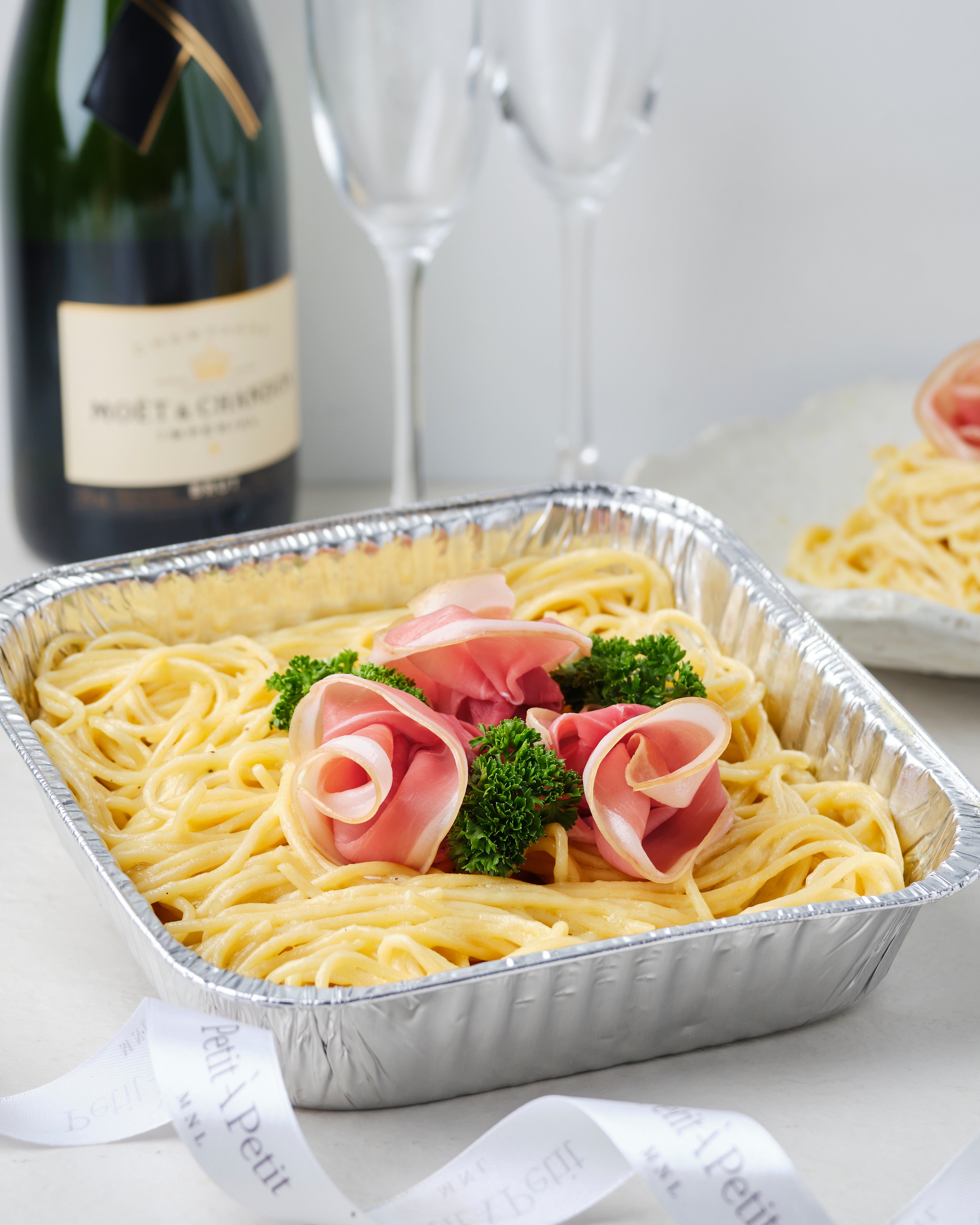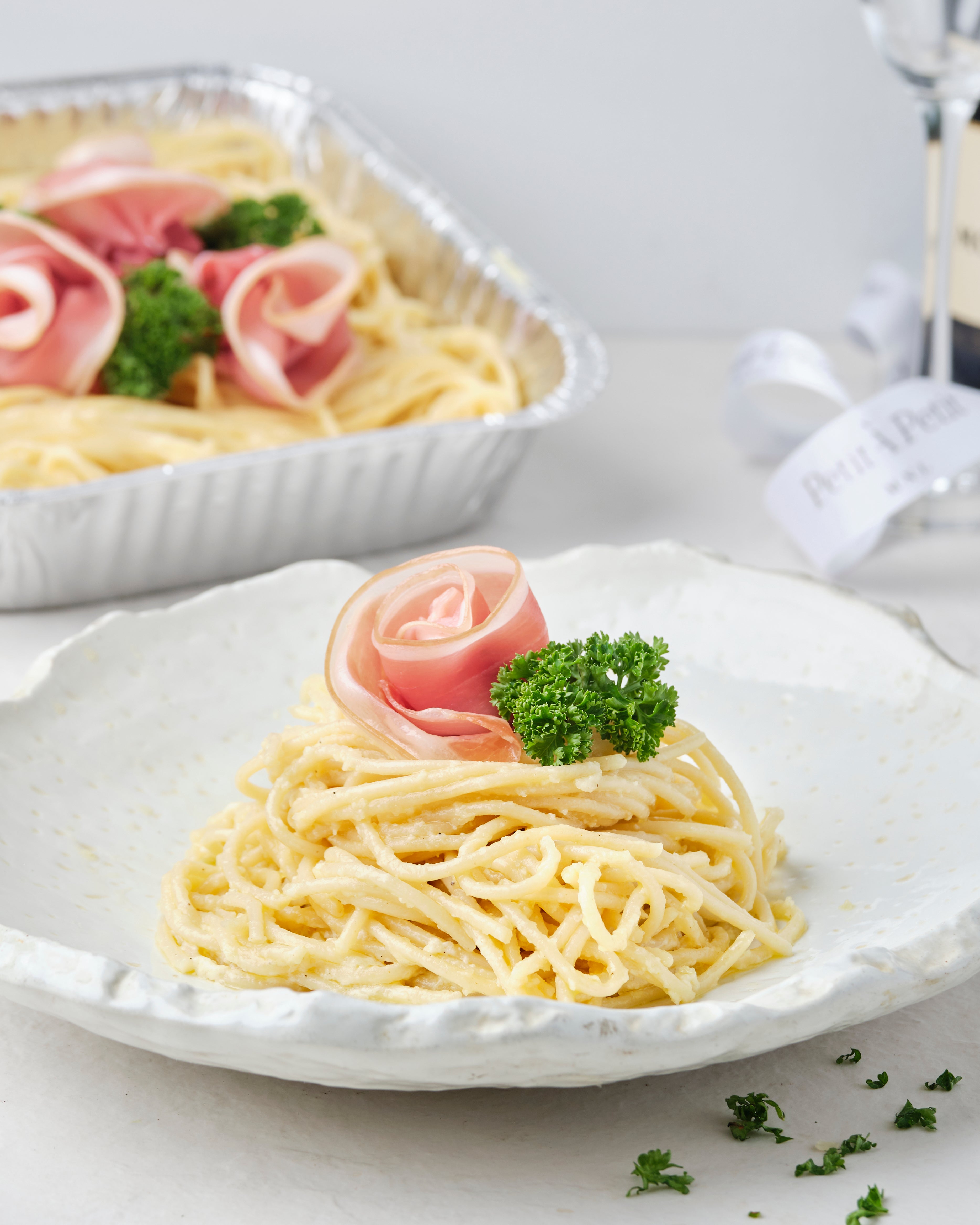 How could you possibly resist a pasta perfectly coated with a luscious and silky cream and parmigiano topped with prosciutto rosettes? The earthy truffle flavor and aroma will make you love this dish as much as we do!